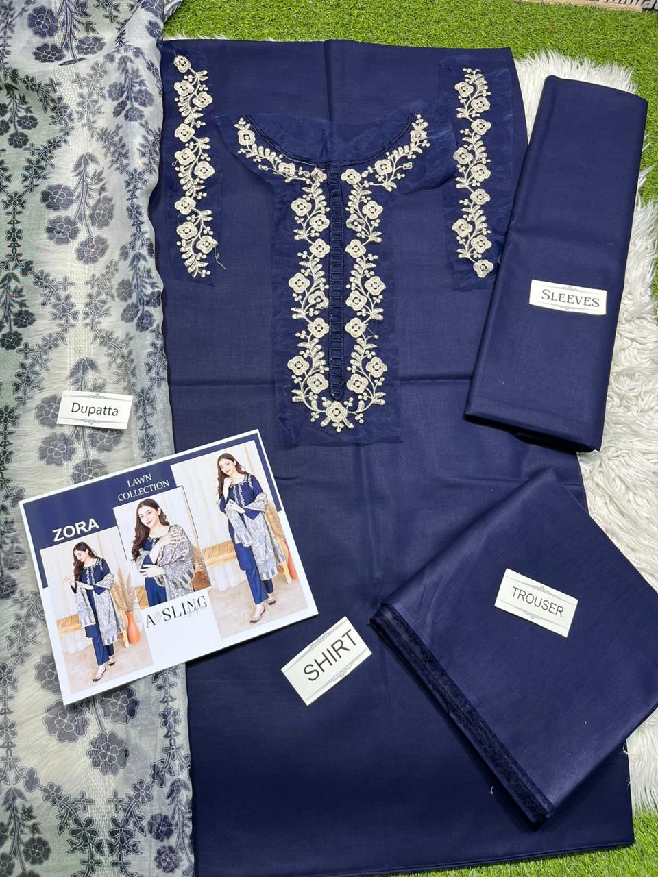 This stunning 3-piece ensemble is made from high-quality 90/70 lawn fabric, ensuring breathability and softness ideal for summer wear. The outfit features a simple yet graceful dyed lawn shirt and trouser set, enhanced with a beautifully detailed heavy neck patch that adds a touch of elegance.