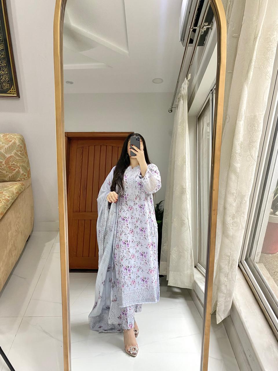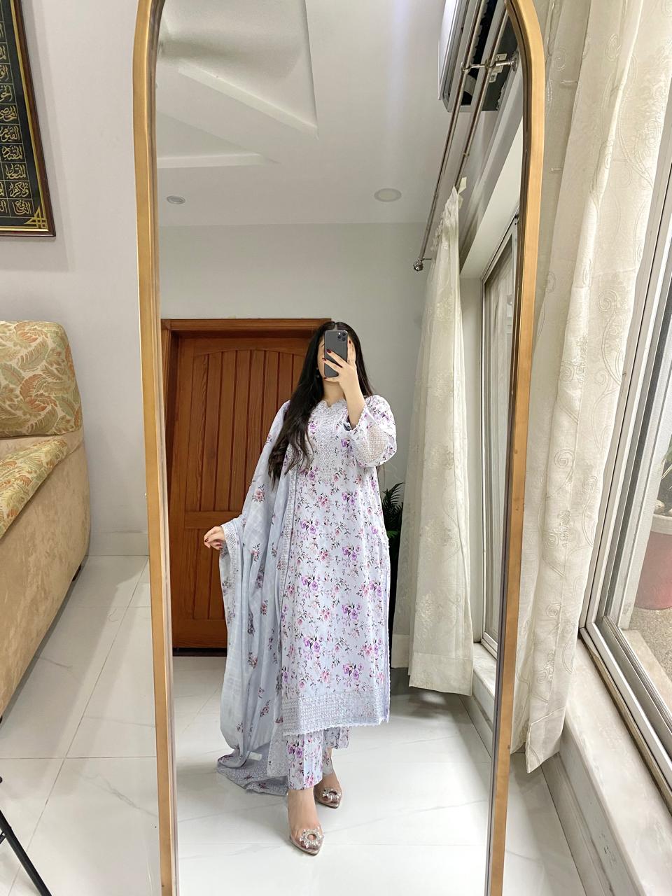 Stay fresh and elegant this summer with 𝐍𝐨𝐨𝐫𝐢𝐳𝐚 𝐅𝐚𝐛𝐫𝐢𝐜 𝐌𝐚𝐫𝐢𝐚 𝐁 𝐋𝐚𝐰𝐧 𝐄𝐦𝐛𝐫𝐨𝐢𝐝𝐞𝐫𝐞𝐝 𝟑-𝐏𝐢𝐞𝐜𝐞 𝐃𝐫𝐞𝐬𝐬 — lime lawn fabric, soft floral prints, and a luxurious Voil Dupatta for effortless sophistication.